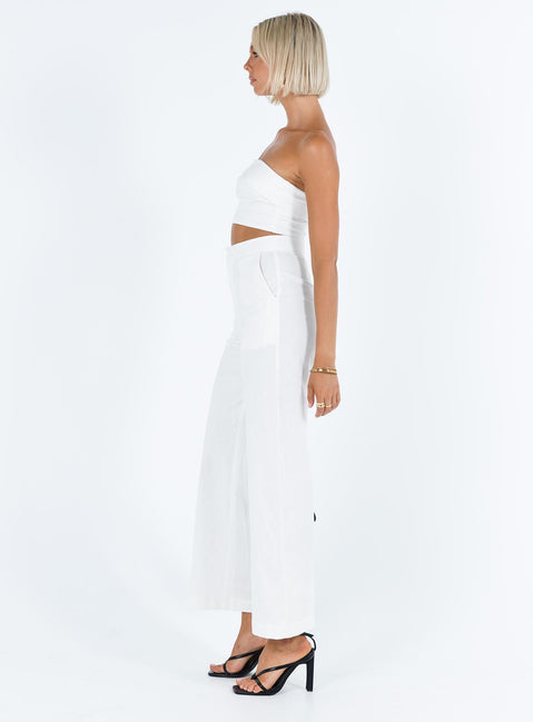 White matching set Linen look material Strapless crop top Folded neckline Inner silicone strip at bust Zip fastening at back High waisted pants Front button and zip fastening  Twin hip pockets