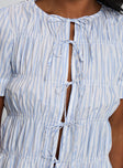 - Stripe pattern, round neckline, split hem with tie detailing at front, elasticated, puff sleeves