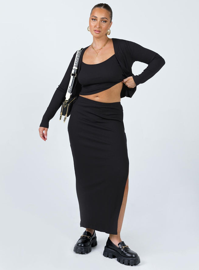 Matching three piece set Ribbed material Long sleeve cardigan  Button fastening at front Crop top Scoop neckline Adjustable shoulder straps Midi skirt Elasticated waistband Slit at side