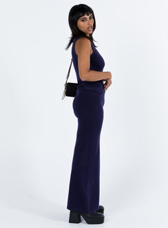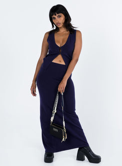 Navy matching set Soft knit material Vest top V neckline Hook AND eye fastening at front Split hem Maxi skirt Thick elasticated waistband