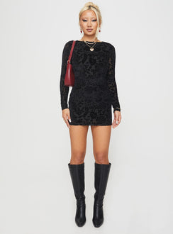- Velvet material, floral print, slim fitting, open back, boat neckline