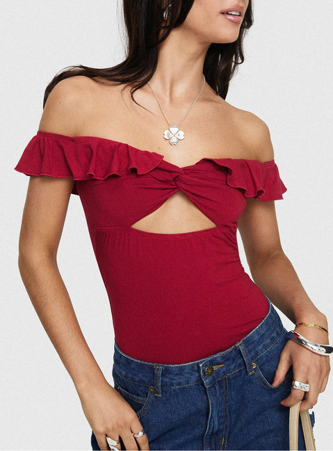 Be careful off the shoulder bodysuit red