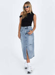 Midi skirt Light wash denim  Belt looped waist Zip and button fastening  Classic five pocket design Distressed detail Spilt hem