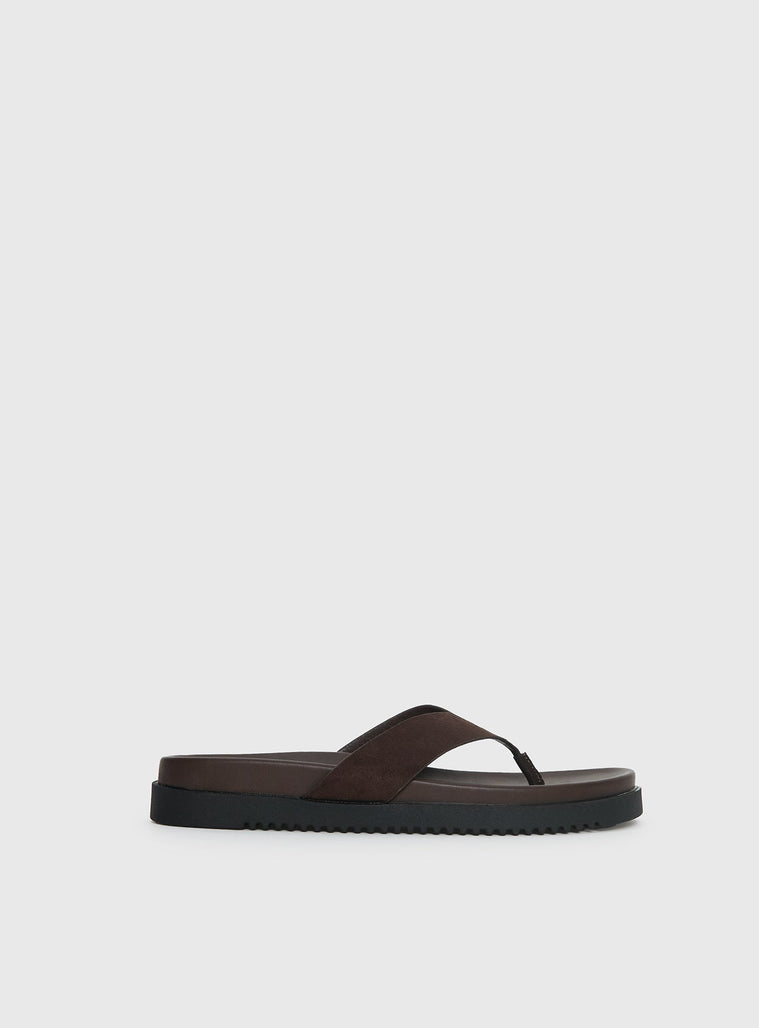 - Suede material, rounded toe, open toe & back, padded footbed, treaded sole