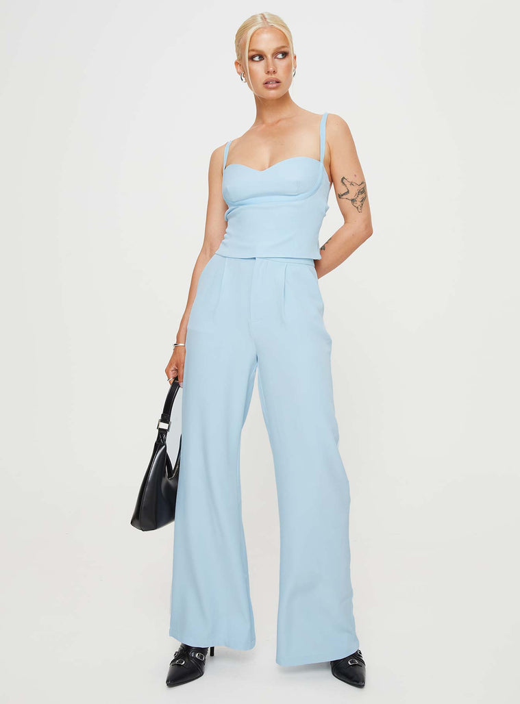 Blue Matching set Sweetheart neckline Hook and eye fastening at back of top zip fastening at back of top pleated pants wide leg