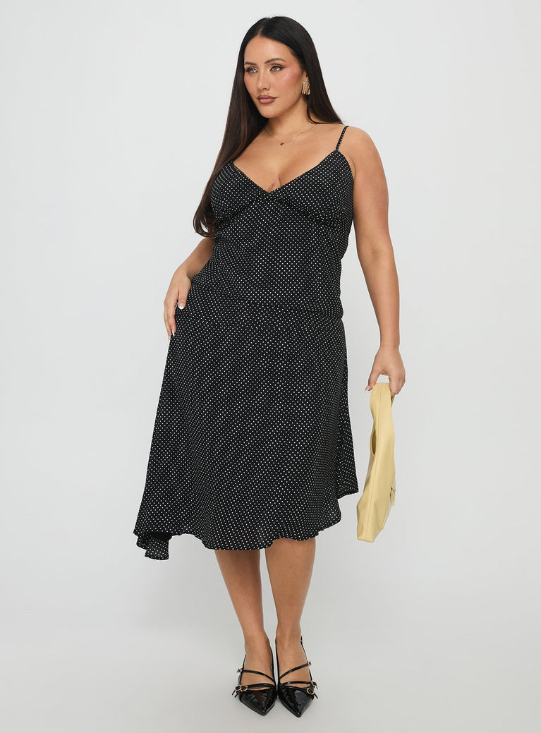 - Cami-style top , v-neckline, lace trim, adjustable straps, side zip closure, mid-rise midi skirt , side zip closure