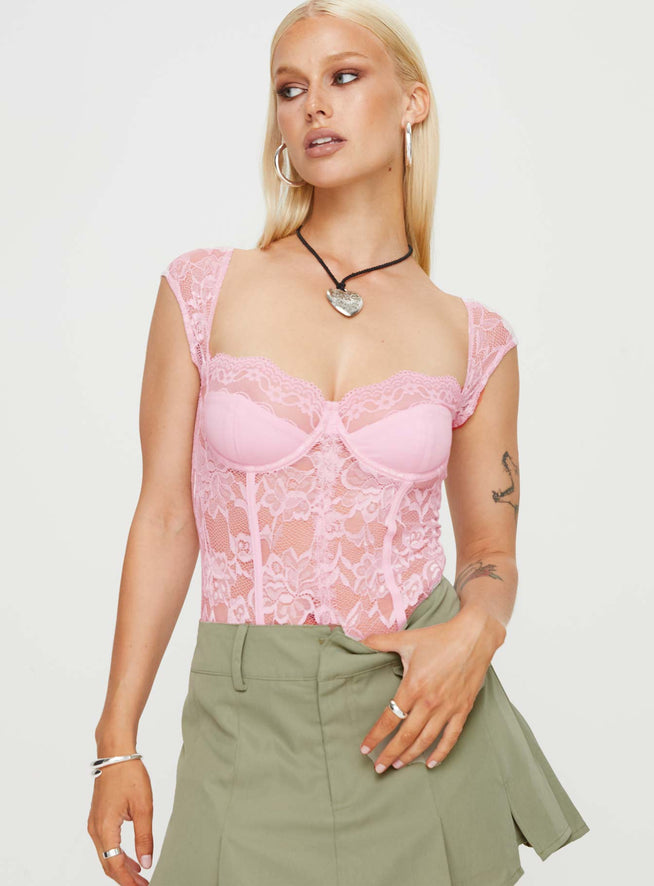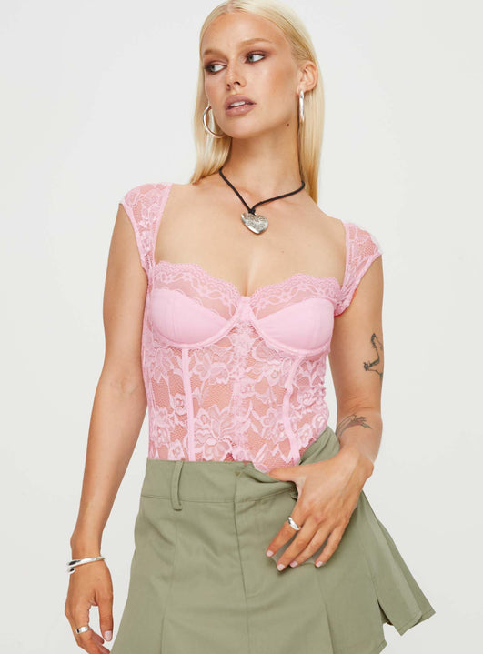 Pink bodysuit Bodysuit Slim fitting sheer lace material cap sleeve
