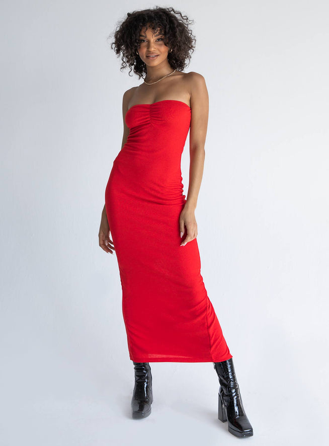 Charm Strapless Midi Dress Red has a rating of 4.7 stars based on 14 reviews.
