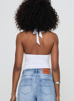back view of model wearing Princess Polly Chilli Halter Top White Sleeveless Plunger