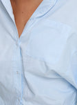side view of model wearing Princess Polly Chips Are Down Shirt Blue Full Sleeves High Neck