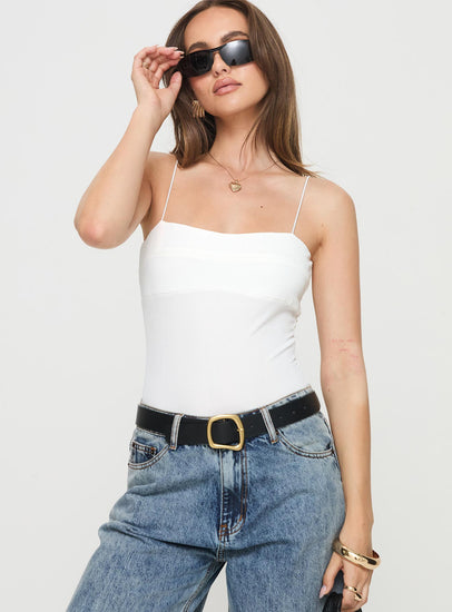 - Straight neckline, elasticated straps, high cut leg, cheeky bottom, press clip fastening at base