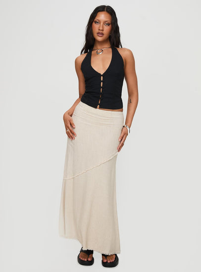 - Diagonal lining detail, raw edge hem, invisible zip at back, mid-rise fit