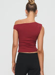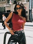 side view of model wearing Princess Polly Danza Top Red Sleeveless Asymmetric Neckline