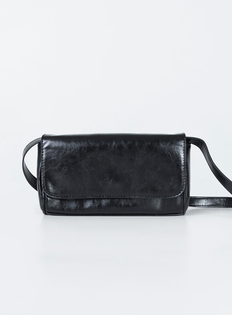 Black shoulder bag Faux leather material Removable & adjustable shoulder strap Magnetic button fastening Single internal pocket External card slip at back