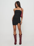 - Strapless, elasticated band at bust, folded detail at bust, invisible zip fastening at back, slit at hem, relaxed fitting