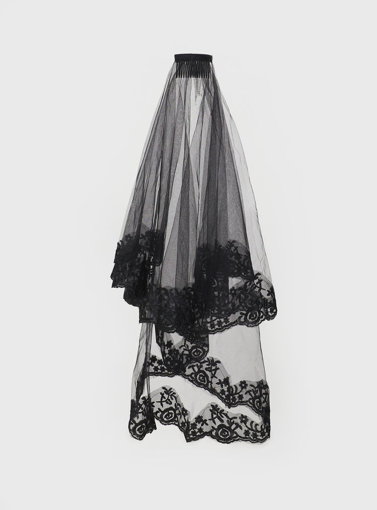 - Two-tiered, lace detailing on the hem, mesh material, hair slide comb