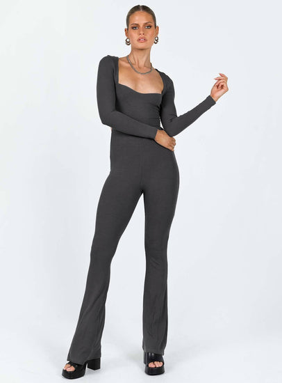 Grey long sleeve jumpsuit Ribbed material Square neckline Cut out at back with tie fastening Good stretch Partially lined