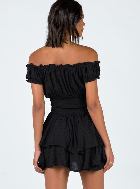 Black romper Can be worn on or off the shoulder Shirred waistband Ruffle detailing Elasticated neck & sleeves