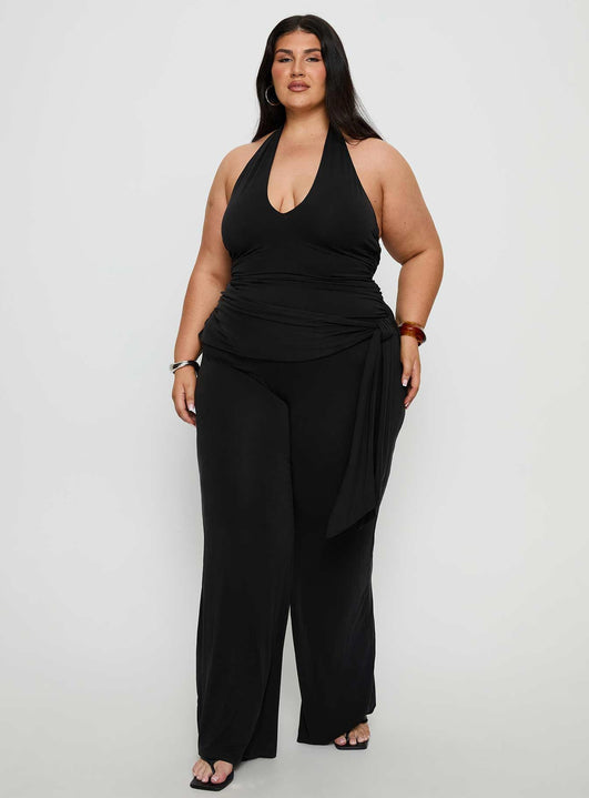 - Plunge neck, ruched, side tie detail, flared hem, adjustable halters, partially open back