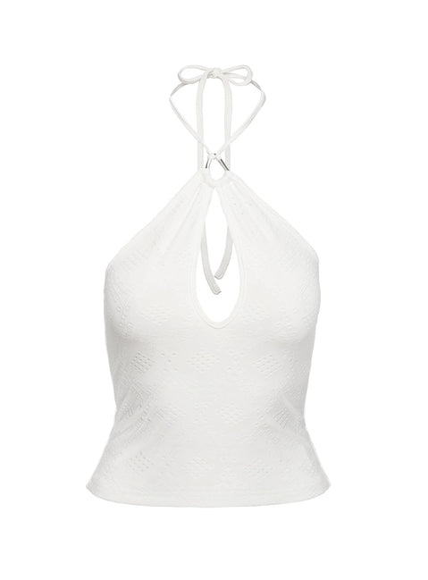 - Halter style with tie fastening, cut out detail at front with silver-toned hoop ring