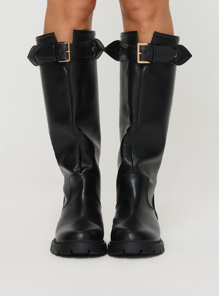 Knee-high boots Riding style, rounded toe, thick sole with grooves, gold-toned buckle detail