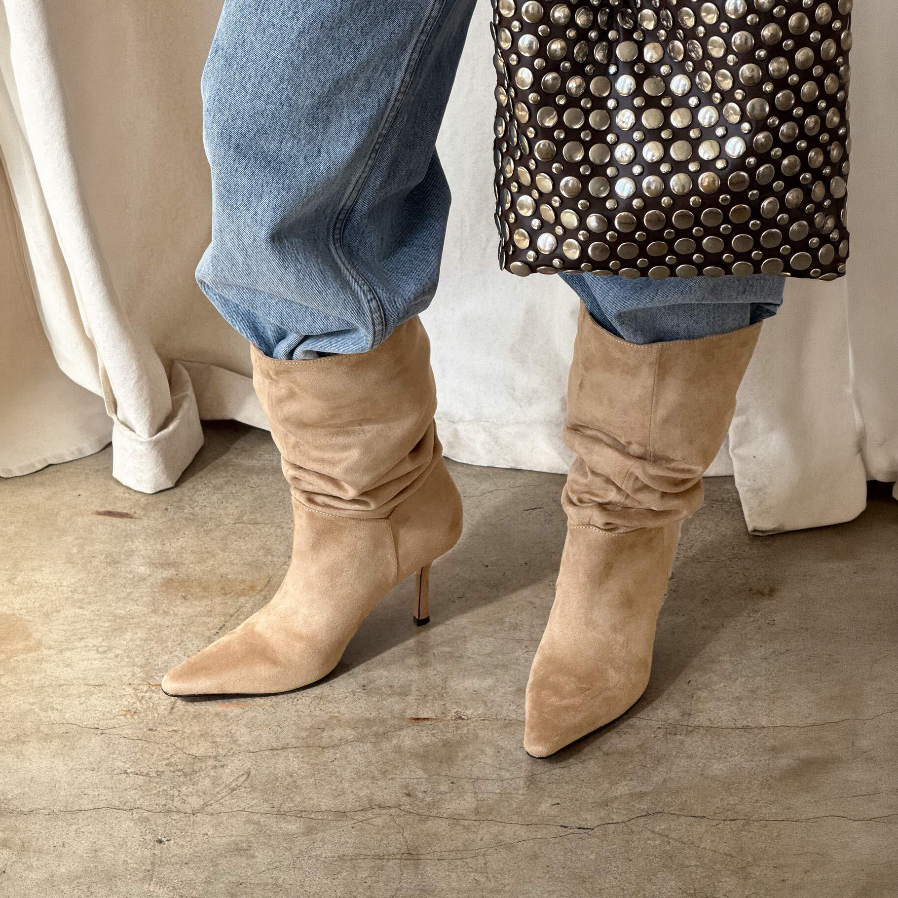 - Ruched waist, zip closure at side, layered hem, soft pleats detail, mid-rise fit