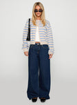 - Stripe print, knit material, crew neckline, ribbed hem detail, drop shoulders