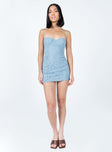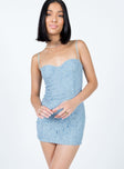 front view of model wearing Princess Polly Fay Mini Dress Blue Sweetheart Neckline