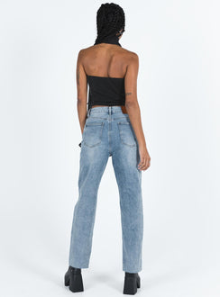 - Mid-washed, belt looped waist, button & zip closure, five pockets, slim leg, raw edge hem