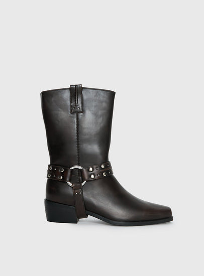 - Faux leather mid-calf heeled boots