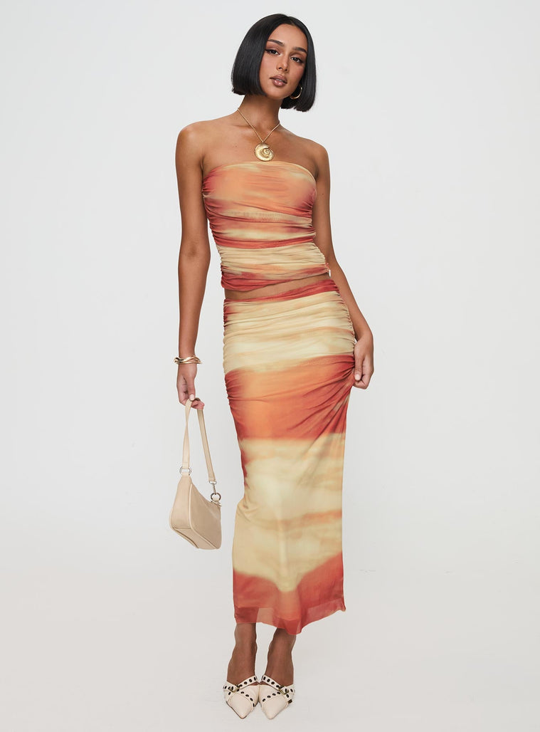 - Maxi skirt, thin elasticated waistband, ruched at sides, high split at side