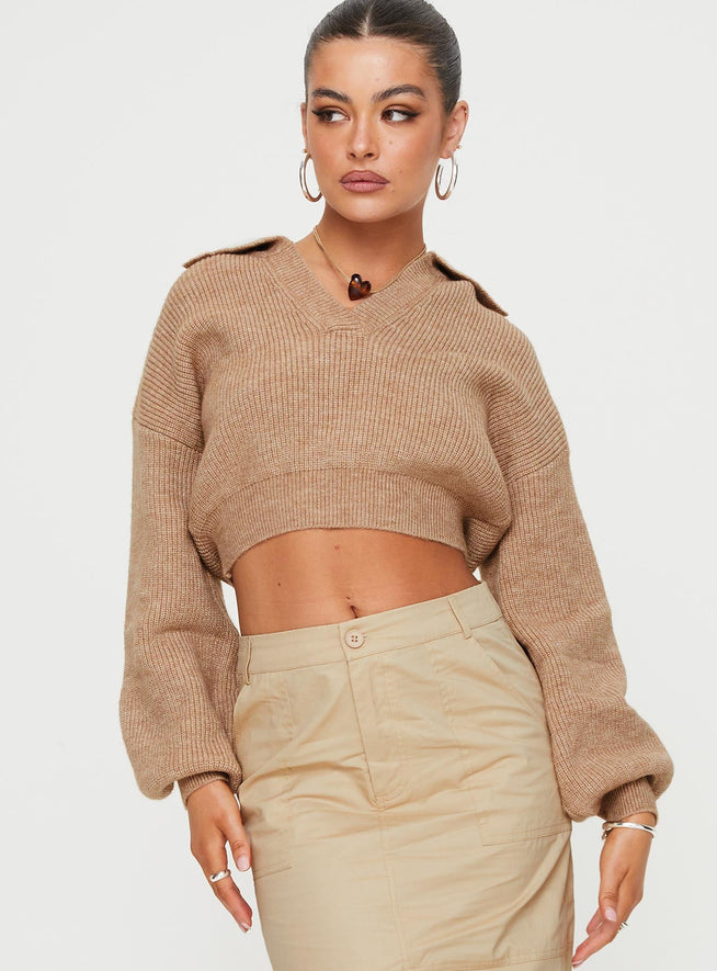 Collared sweater, knit material Crop style, v-neckline, balloon sleeves, ribbed cuffs and waist