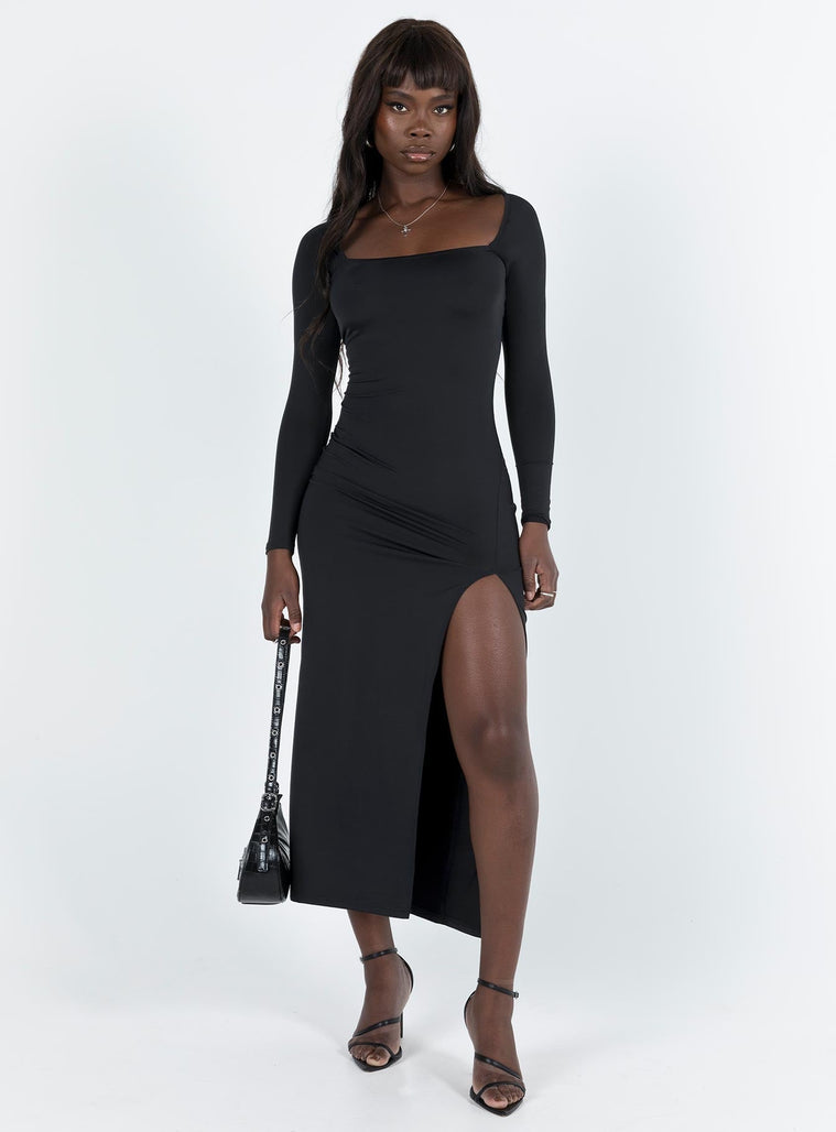 front view of model wearing Princess Polly Hayward Long Sleeve Midi Dress Black Square Neck
