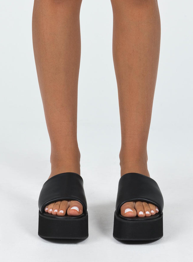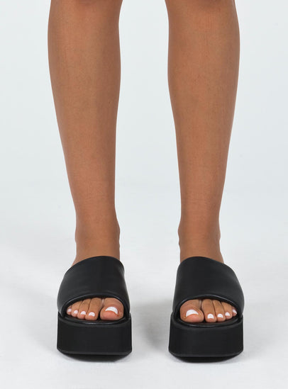Platform slides Faux leather material Single thick upper Square toe Padded footbed