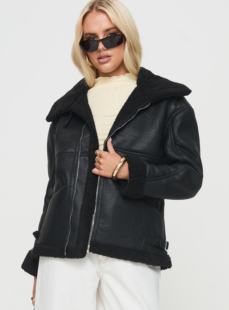 - Faux leather, oversized collar, exposed zip fastening, twin pockets