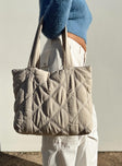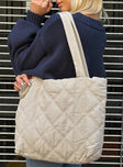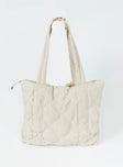Beige tote bag Quilted design  Contrast stitching  Twin handles  Zip fastening Three internal pockets Fully lined