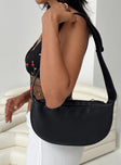 Black shoulder bag Faux leather material Adjustable shoulder strap Zip fastening  Gold toned hardware Flat base