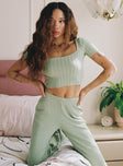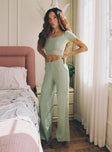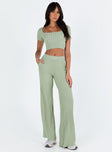 Two piece set Knit ribbed material Crop top Inner silicone strip along shoulders Wide neckline High waisted pants Thick elasticated waistband Twin hip pockets Wide flared leg