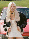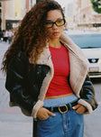 Oversized jacket Faux leather material Faux fur lining  Buckle fastening at neck  Press buttons Zip front  Fully lined