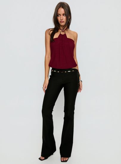 - Flared pants with a button belt & mid-rise fit