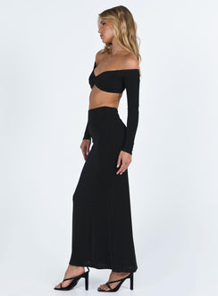 Black matching set Long sleeve crop top Off the shoulder design Knot detail at bust Maxi skirt Thin elasticated waistband Good stretch Partially lined