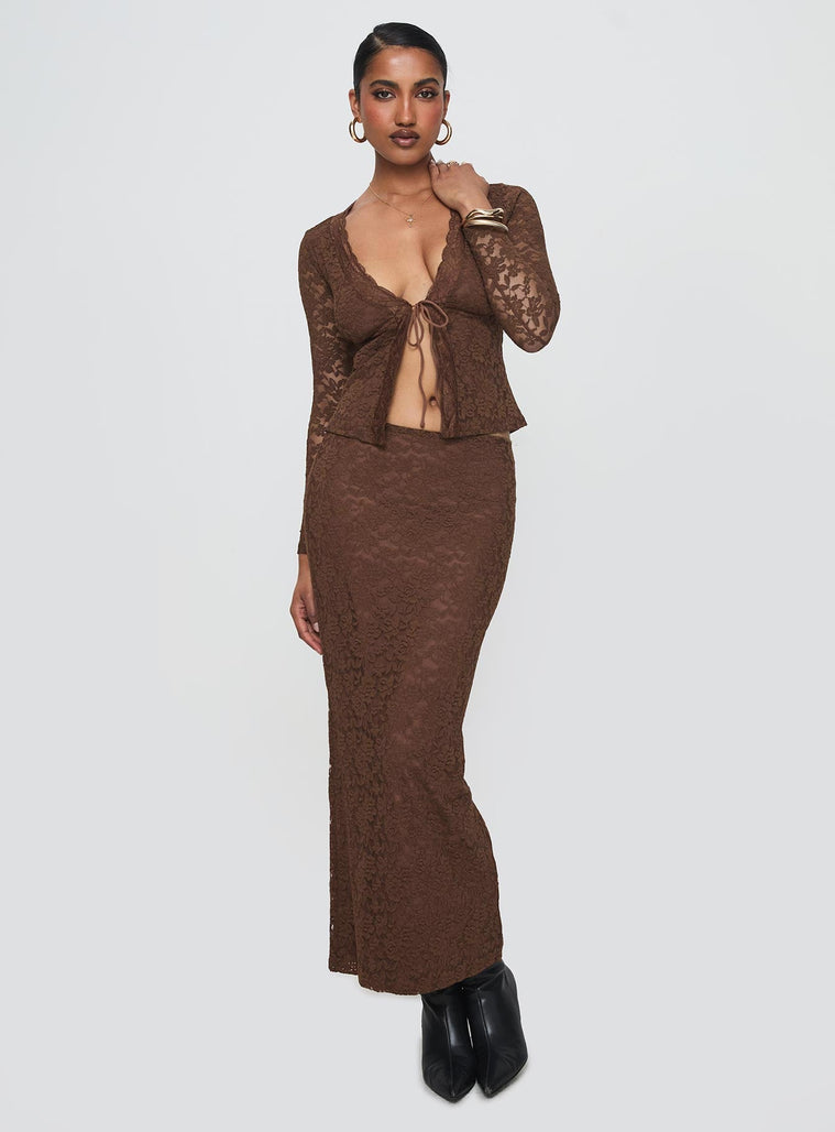 - Tie top, scoop neckline, split hem, mid-rise maxi skirt, elasticated waistband
