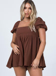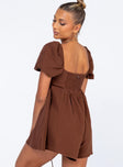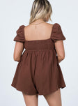 Romper Muslin material Square neckline  Elasticated puff sleeves Shirred back panel Invisible zip fastening at back  Relaxed leg