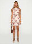 - Floral check print, boat neckline, hook & invisible zip fastening at back, tie-back fastening