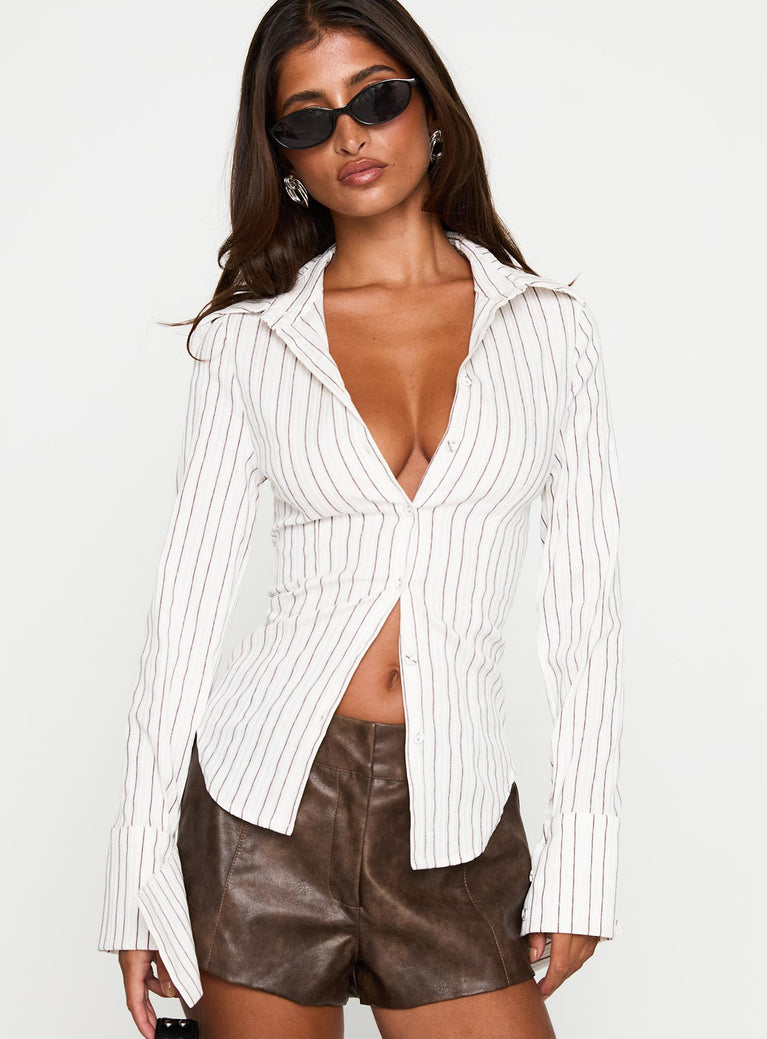 front view of model wearing Princess Polly Madlin Long Sleeve Top Beige Stripe Full Sleeves V-Neck