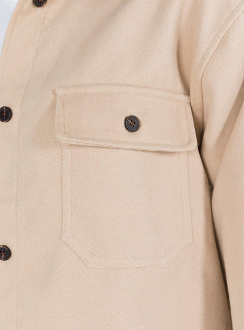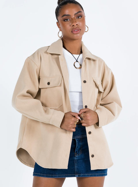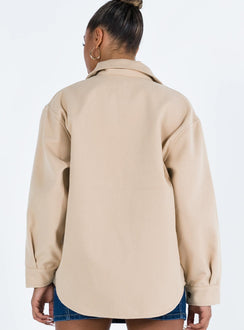 Beige jacket Soft material Pointed collar Button fastening at front Twin chest pockets Single button cuff