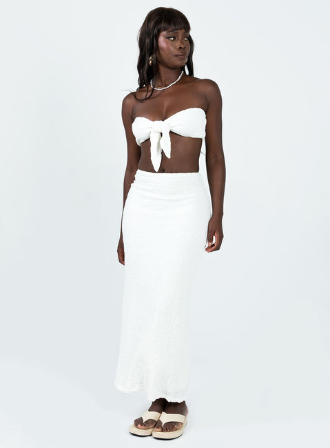 Two piece set Textured material Strapless top with front tie fastening Inner silicone strip at bust Maxi skirt Invisible zip fastening at back  Slit at back Good stretch