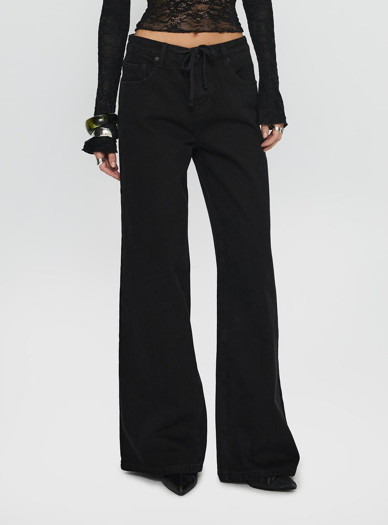 - Black-washed, belt looped waist, button & zip closure, drawstring at waist, five pockets, branded patch at back