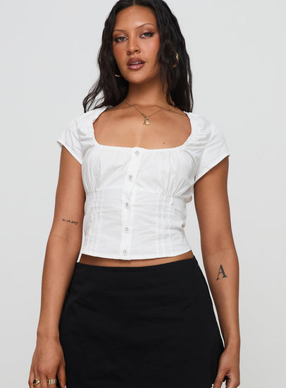 - Square neckline, ruched bust & shoulders, petal sleeves, tie-back detail, cropped