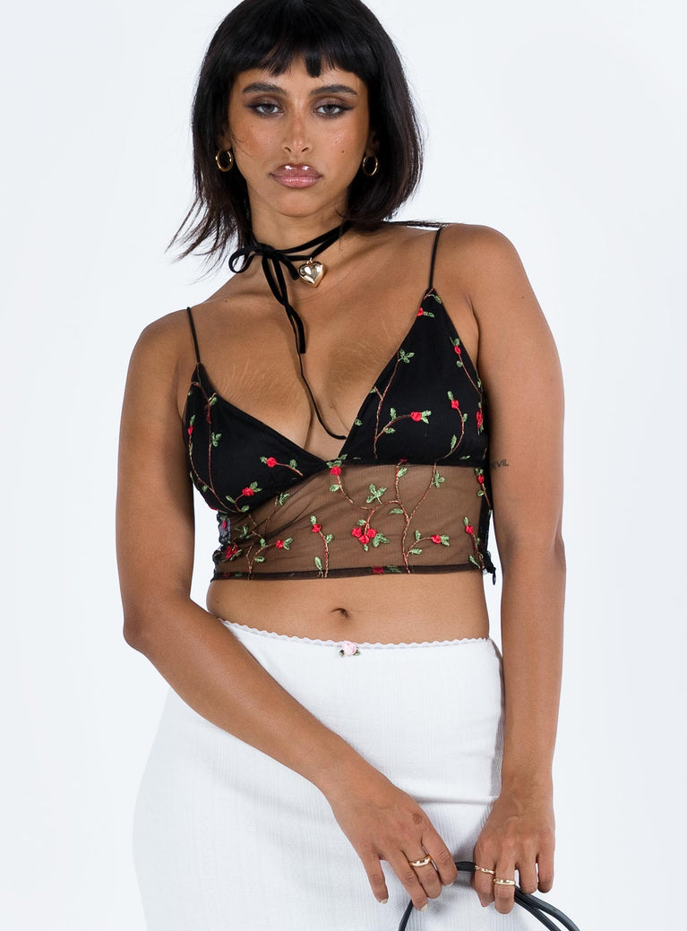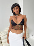 Black crop top Mesh material Floral embellishments  Elasticated shoulder straps Plunging neckline Invisible zip fastening at side Good stretch Lined bust